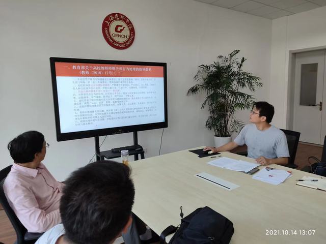 2021年10月14日,通识教育学院党支部“师德师风专题学习活动”第四场如期举行。活动第一阶段,在支部组织委员袁江老师带领下,支部成员学习了有关高校教师师德师风建设的重要文件。早在2011年,教育部与中国教科文卫体工会全国委员会就研究制定了《高等学校教师职业道德规范》,要求高校教师爱国守法、敬业爱生、教书育人、严禁治学、服务社会、为人师表。2018年11月,教育部又印发了《新时代高校教师职业行为十项准则》(以下简称“十项准则”)及配套的《教育部关于高校教师师德失范行为处理的指导意见》(以下简称“指导意见”)。“十项准则”要求,高校教师应坚定政治方向,自觉爱国守法,传播优秀文化,潜心教书育人,关心爱护学生,坚持言行雅正,遵守学术规范,秉持公平诚信,坚守廉洁自律,积极奉献社会。“指导意见”强调,高校教师要自觉加强师德修养,严于律己,为人师表,对师德失范行为必须承担相应的责任;而高校是落实师德建设的主体,要对师德失范行为采取严格的“一票否决”。“十项准备”和“指导意见”出台的意义在于,一方面,及时纠正教师队伍中存在的理想信念模糊、育人意识淡薄、放弃自我要求等影响学生健康成长的个别现象;同时,