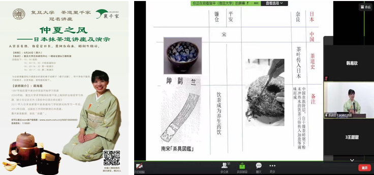 外国语学院日语系为了提升思政教学的亲和力,促进学生汲取日本文化知识,激发对中日文化的关注度和日语学习兴趣。日语系充分利用第二课堂资源开展了“身边的思政课”实践讲座系列活动——日本抹茶道讲座及演示。本次实践讲座活动是由上海民办高校日语教学协作组倡导,复旦大学日本研究中心举办,以跨文化交际教学为核心,运用线下演示线上研讨混合型讲座模式,于6月26日在复旦大学三楼茶道展示厅举行。活动中,茶道专家蒋海霞(裹千里准教授,茶名“宗霞”)详细介绍了中日茶道史文化、茶道流派以及茶道的各类形式,同时剖析了日本的“三道”文化(即茶道、花道、书道)之间的汉文化背景,讲座分知识讲解和现场演示二个部分。日语系20级90余名学生通过线上不同场次参加了本次活动,学生们深深感受到日本茶道文化独特魅力的同时也领略了汉文化的内涵。活动当天也吸引了大批爱好日本文化的师生参加。据悉,“身边的思政课”实践讲座系列活动是日语系《应用型日语本科试点专业》改革项目中第二课堂思政建设《中日文化比较》板块的分支体系,是一项以“透析中日文化,灵融语言真谛”为宗旨的学生文化活动。此项文化活动为喜爱中日本文化的师生构筑学习互动的平台,通过深层