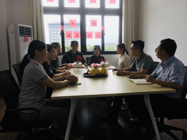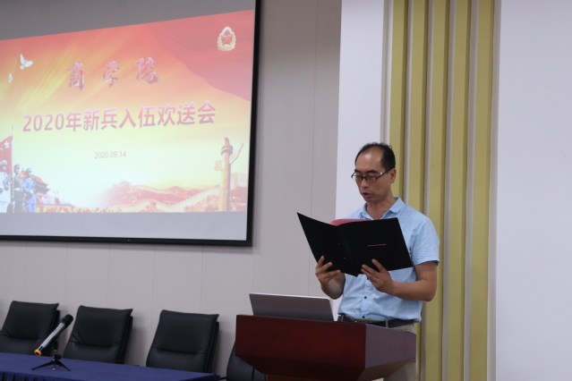 9月14日下午,新闻传播学院在学院楼219举办2020年新兵入伍欢送会,热烈欢送19级新闻1班陶奕宇和19级网媒1班史太尉两位同学。出席本次活动的有:新闻传播学院党总支部书记冯修文教授,新闻传播学院党总支部副书记吴成皓老师以及新闻传播学院辅导员贾存忠、吴珍珍、田红玲三位老师。吴成皓老师主持欢送会,对两位优秀青年投身军营表示热烈祝贺。贾存忠老师是学院征兵工作的负责人,寄语两位学子向优秀前辈看齐,明确自己的人生目标。两位新战士也畅谈了自己立志入伍、过关斩将,实现梦想的征兵经历。冯修文书记深情寄语:一、热烈祝贺,不忘师恩。在未来的人生中亮丽光彩,走好每一步;二、做好吃苦准备,听从指挥。“不吃苦中苦,难成人上人”;三、抓住机会,历练自身。积极向上,不断进步,成就不一样的人生,成为一个充满正能量的青年。祝走好人生路,越走越宽阔。最后冯修文书记和贾存忠老师代表学院向两位学生赠送了礼品。