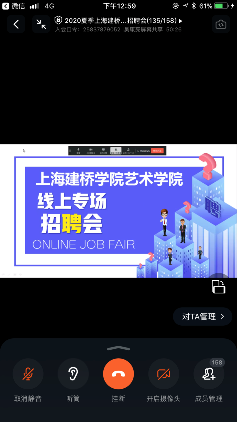 6月19日下午,艺术设计学院为了更好的解决2020届毕业生就业及2017级学生实习难题,举办了“艺术设计学院网络专场招聘会”。院长葛洪波、总支书记周智明、副院长孙鹏、副书记王丽佳在线与用人单位和毕业生沟通交流。因疫情原因,今年就业形势相对往年不容乐观,学院克服困难联系校企合作单位,促成此次20家企业100多个岗位的专场线上招聘会,参与本次招聘的学生达380余人。招聘会上,葛洪波院长代表学院,对关心和支持我们学生就业和实习工作而前来参加本次招聘会的企业,表示热烈的欢迎和衷心的感谢,上海剑灵信息科技有限公司的王总,代表参加招聘的企业来宾发言,在王总的发言中,与会师生感受到企业在招聘中,非常看重应聘者的综合素养和专业能力。参加本次专业招聘会的不仅有2020届毕业生,还有17级在校的大三同学。毕业生想通过招聘会找到适合自己工作,大三的同学想通过招聘会了解企业用人的要求和提前找到自己的实习岗位,并在与企业的交流中,增强自己的表达能力和应聘阅历,明确自己的努力方向。通过本次招聘会我院有20多名同学与企业达成就业和实习意向。此次招聘会,不仅为我们毕业生提供了应聘机会,同时也让同学们对于现实严峻的就业