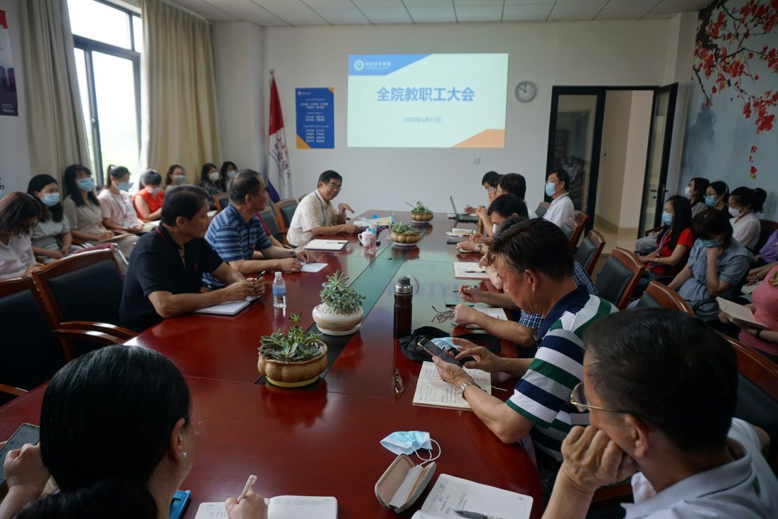 6月11日上午,职业技术学院在247会议室召开全院教职工大会。会议通报学院重要人事安排,校长朱瑞庭、校党委组织部副部长施荣瑜出席,职业技术学院全体教职工参加。会议由施荣瑜副部长主持。会上,校党委组织部副部长施荣瑜宣读了学校《关于焦庆堂、谷伟等职务任免的通知》《关于成立健康管理学院的通知》文件,通报了学院重要人事任免及组建成立健康管理学院的相关事项,任命谷伟副教授担任职业技术学院院长,在护理相关专业基础上,成立健康管理学院,焦庆堂院长转任新成立的健康管理学院院长,吴亚初担任健康管理学院副院长。职业技术学院老院长、健康管理学院院长焦庆堂,职业技术学院新任院长谷伟,健康管理学院副院长吴亚初等分别表态发言。焦庆堂院长在发言中,饱含深情地回顾了自己担任职业技术学院院长期间与学院领导班子、教职员工间的深厚情谊,在工作中收获了友谊与成长。他表示,职业技术学院在全体教职工的共同努力下,当前正呈现良好的发展势头,取得这些成绩来之不易,离不开全体教职工的辛勤奉献,他对全院教职工在自己担任职业技术学院院长期间的工作上的支持表示衷心的感谢。对于此次学校党政关于学院人事的安排,他表示坚决服从和全力配合,感谢学校