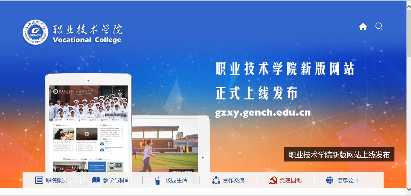 为进一步增强学院对外宣传效果,充分展示学院教育教学成果和专业发展特色,在学校分管领导、校办的支持和职业技术学院领导班子的重视下,学院在上学期末启动了新版网站建设,经过前期的组织、策划和实施,于近日正式上线运行,网站地址:gzxy.gench.edu.cn。职业技术学院新版网站由学院自主设计,委托苏迪公司施工制作,新版网站网站建设注重服务性、时尚性和特色性,全新的页面设计紧跟时代前沿,色调风格、版块分布、功能设置及内容推广等实现了全面优化。网站主色调采用蓝色,寓意职院以培养“高技能应用型蓝领人才“为己任,整体页面清新简洁而又不失庄重。新版网站更加突出图片和视频的视觉效果呈现,首页采用大图形式,同时也可在首页发布短视频,发挥醒目全屏的宣传作用。 在栏目上,新版网站对栏目设置进行了精简、整合。“现设“职院概况”“教学与科研”“校园生活”“合作交流”“党建园地”“信息公开”等6个一级导航栏目,方便访客访问和查询学院基本情况和学院特色,及时了解学院资讯和动态,同时,特别强调“党建”色彩,一级导航栏目中,设有“党建园地”,并以红色字体突出强调,专门展示党建特色活动。页面模块上,设有“新闻速递“通知