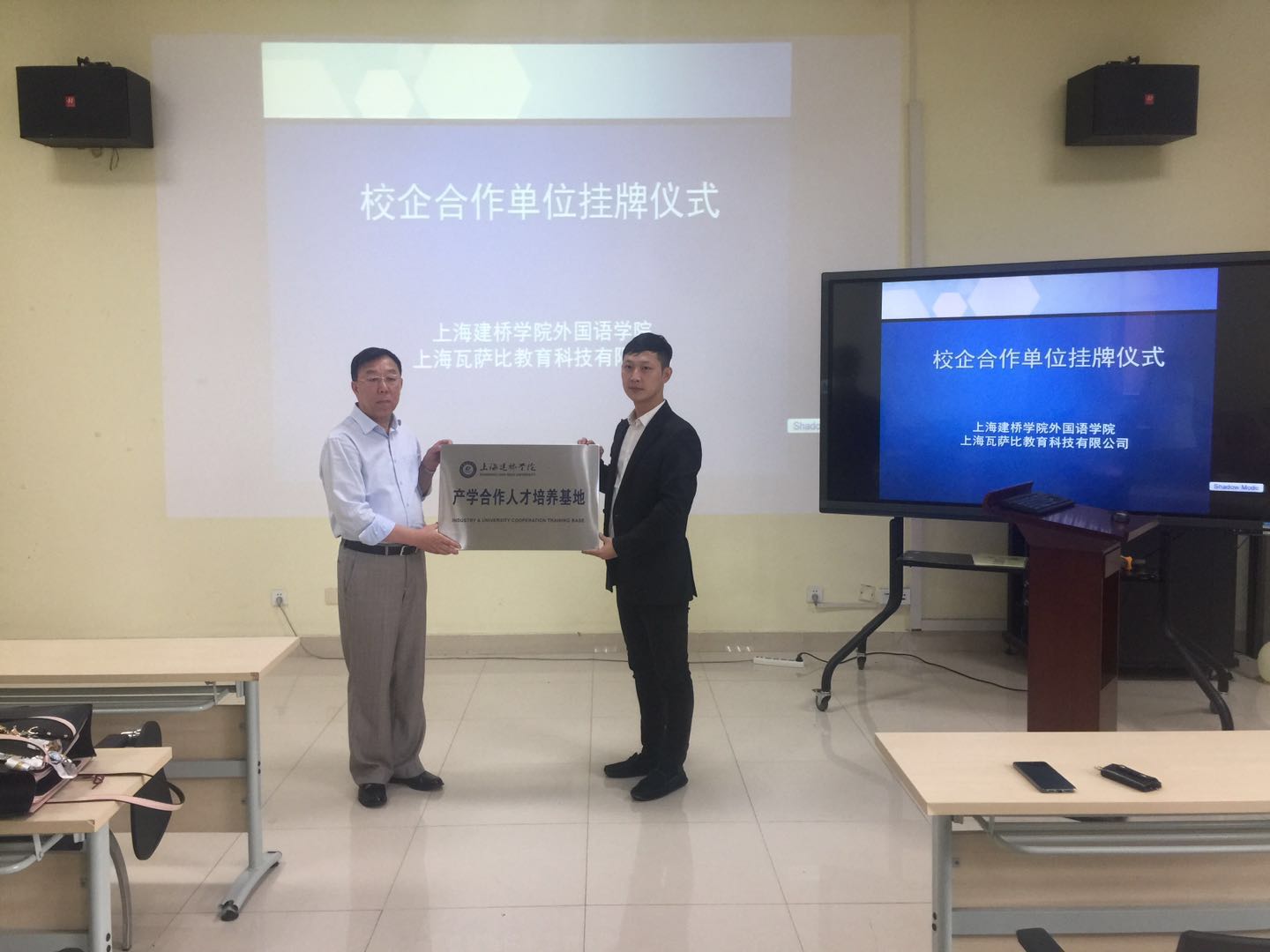 2019年6月13日中午12:30,外国语学院于9129举行了校企合作单位挂牌仪式及企业宣讲会。外国语学院日语系与上海瓦萨比教育科技有限公司签订了校企合作协议,这是外国语学院产学合作的又一大成果。上海瓦萨比公司的董超总经理一行人员来到建桥,与老师和同学们就今后的合作进行了一系列探讨和交流。出席本次仪式的还有外国语学院毛立群院长、江萍书记、孙俊芳副书记、日语系章虹主任、贺亚茹老师以及16级的同学们。首先举行的是挂牌仪式,由毛院长将“产学合作人才培养基地”标牌授予瓦萨比公司。之后章主任发言,向瓦萨比公司介绍了日语系的专业和课程设置、师资力量、班级构成和学生情况等。在之后的宣讲会上,由瓦萨比公司的负责人董总和曹老师向同学们系统地介绍了公司情况。上海瓦萨比教育科技有限公司(满点高考日语)是国内首家专注于日语高考和赴日留学的公司,可以为有志于做日语老师的日语系同学们提供实习和工作机会。公司负责人向大家详细介绍了公司情况、薪资待遇、晋升制度、工作环境、以及对日语老师的要求等大家关注的问题。16级同学们下学期开始就升入大四了,这对于同学们而言也是一个理想的考虑方向。今后校企双方定会加强交流合作,为同