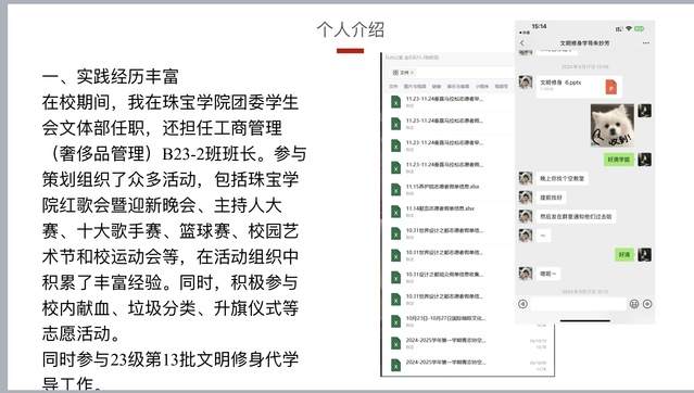 为进一步弘扬校园文明风尚,发挥学生骨干的引领作用,上海建桥学院珠宝学院于2025年3月12日举办“文明修身学导”竞聘答辩会。11名来自不同专业、年级的优秀宝院学子依次登台,围绕个人能力、志愿服务经历及未来规划展开竞演,展现出珠宝学子“知行合一、修身明德”的青春担当。陈天乐班级:奢管B23-2班 职务:珠宝学院学生会文体部成员、班长亮点:- 活动策划经验丰富,曾组织多项校园活动; - 积极参与志愿服务,获雷锋铜奖、银奖; - 性格外向谦逊,沟通能力强,师生认可度高; - 规划清晰:若当选,将开展文明主题活动,引导学生树立正确价值观。侯进怡班级:产设B22-1班职务:珠宝学院自管会常务会长亮点:- 志愿经历突出:西藏“大学生导师”支教志愿者,参与图书馆、垃圾分类、航海博物馆等志愿活动; - 连续两年投身宣传、迎新等室外志愿服务; - 奉献精神显著,对文明修身工作充满热忱。花雁文班级:奢管B23-1班 职务:班长、校党建中心等多部门干事亮点:- 综测专业第三,获优秀学生干部、雷锋铜奖等荣誉; - 学生工作经历丰富,组织协调能力突出; - 对学导工作规划明确:短期熟悉业务,中期创新管理,长期总