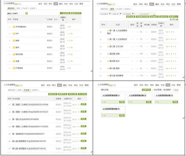 7、配套的习题库(人力资源管理873题、管理学534题):随时可以自动或手动生成作业库和试卷库。习题库对在线授课的重要性无论怎么渲染都不为过。有了习题库,可以有针对性的布置预习任务、随堂测验、课后巩固、学生自测、在线考试等。(下面以人力资源管理为例)