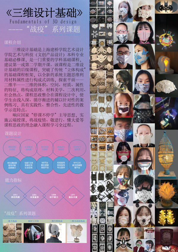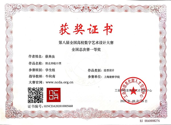 学生组中,环境空间设计类别一等奖作品《城市亲子互动空间室内设计》,施俊杰、怀忆文同学以城市化进程中家庭陪伴中亲子矛盾作为切入点,探索促进儿童适度陪伴的空间。造型设计类别一等奖作品《防止回收口罩》,蔡典汝同学考虑到疫情期间,存在的恶性回收已用口罩的现象,设计了一款有撕拉条的口罩,防止口罩恶性回收现象。