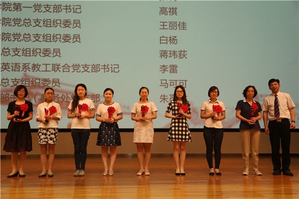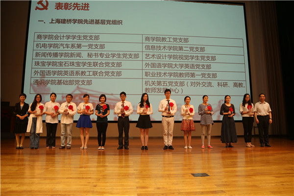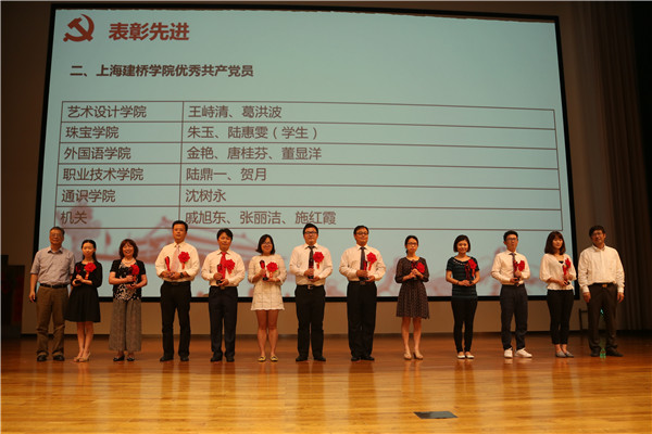 潘迎捷校长宣读了《关于表彰先进基层党组织、优秀共产党员及优秀党务工作者的决定》:信息技术学院党总支获市社会党委先进基层组织荣誉;冯修文获市教卫系统党委优秀共产党员;外国语学院英语系教工联合党支部等12个先进基层党组织、刘立华等26名优秀共产党员、曹艳萍等9位党务工作者受表彰。