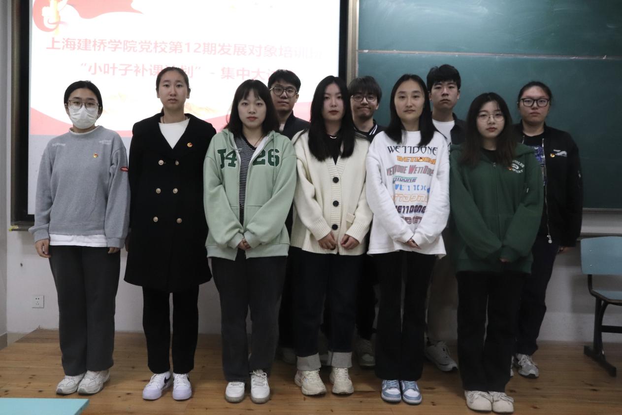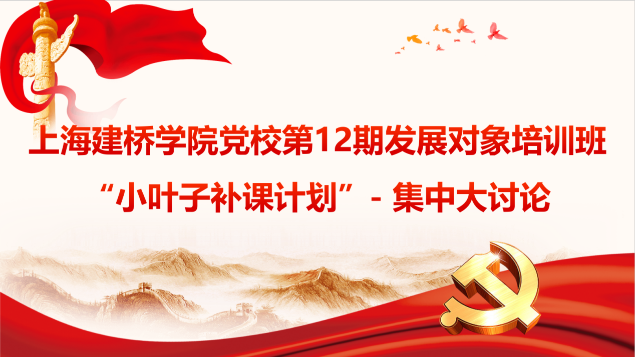 上海建桥学院党校第12期发展对象培训班“小叶子补课计划”组织进行了三次活动,分别是2023年11月23日中午11:40–12:00红色服务队、下午16:10于三教106教室观看视频学习专题报告《中国共产党与中国式现代化》和11月26日下午14:30于三教106教室进行集中大讨论。