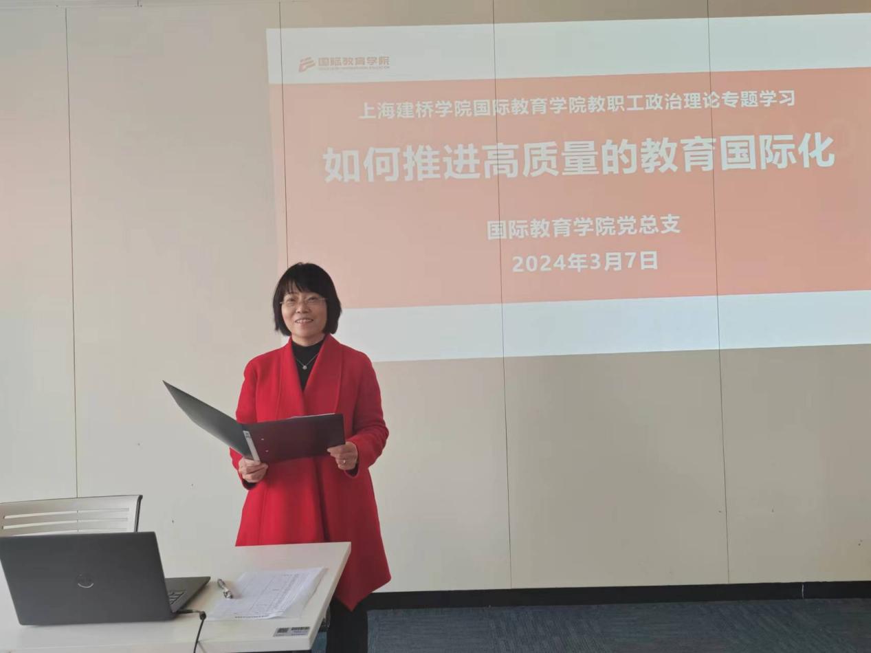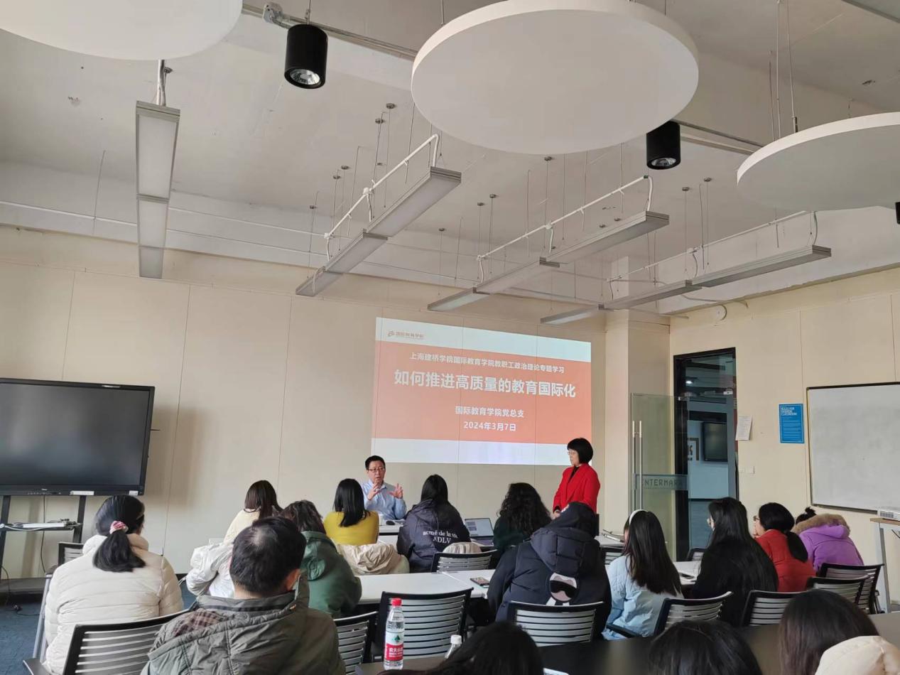 为进一步加强学院教职工政治理论学习,切实提高教职工的政治素质和理论水平,根据国际教育学院教职工政治理论学习计划,我院党总支联合机关党总支第五党支部以“如何推进高质量的教育国际化”为主题,通过自学、集中学习和交流研讨的形式进行专题学习。本次专题学习中,特邀上海市高教学会国际交流专业委员会秘书长、上海交通大学应用型高校发展研究中心执行主任王武东副教授作“应用型高校教师国际化素养的培养”专题报告会。参加报告会的有国际教育学院全体教职工和机关党总支第五党支部部分党员,会议由国际教育学院党总支书记周英芬主持。