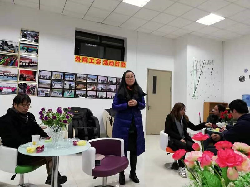 副院长王海燕代表无党派人士发言,号召全体教师努力钻研教育教学,改进教学方法,提高教学质量,努力使学生的大学英语四六级、英语专四专八、日语专四等通过率在2020年有新的突破。
