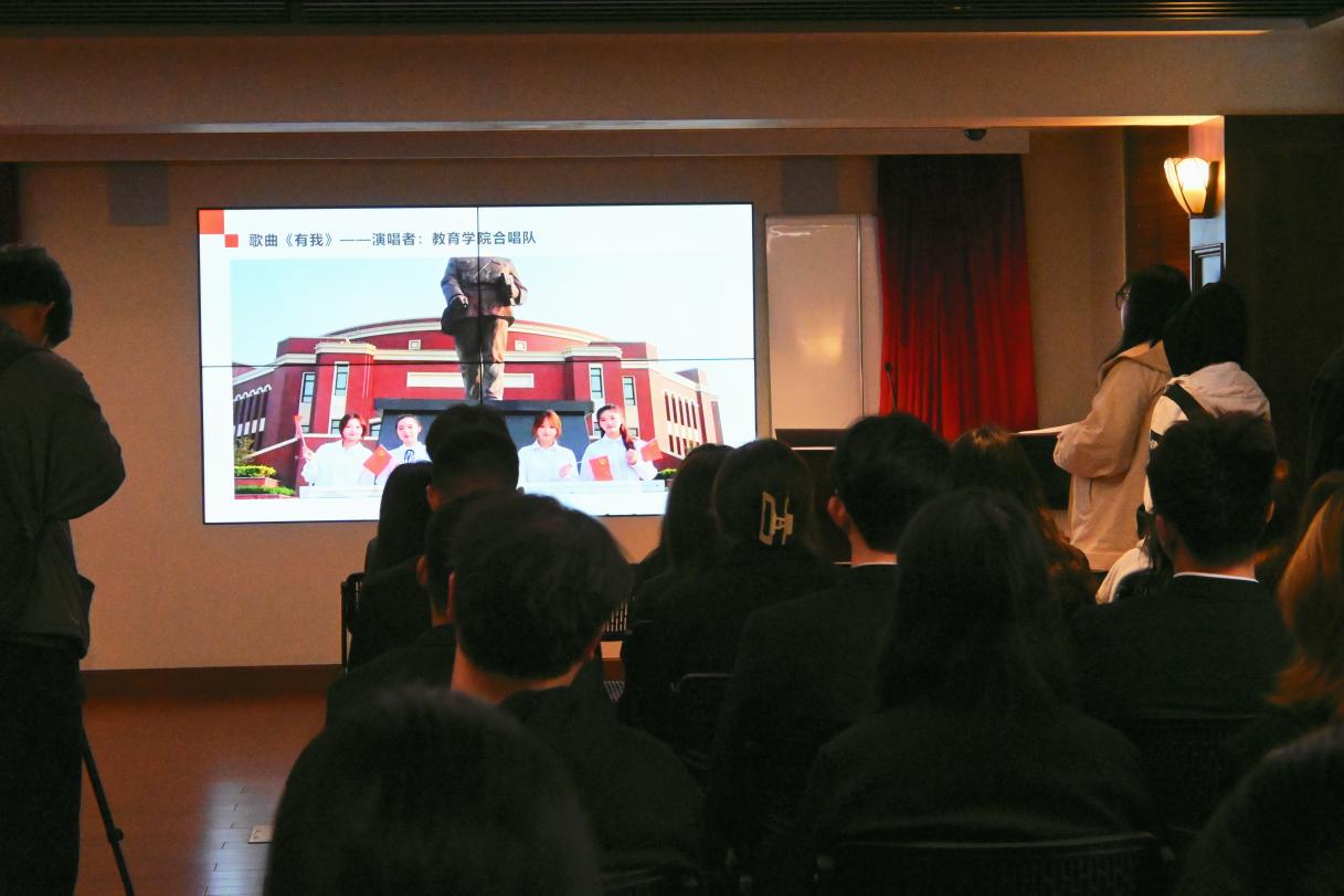 谢丹萍和卞浩老师演唱歌曲《不忘初心》,充分表达了全体师生不忘初心使命的重任与担当。教育学院学生合唱队为本次音乐党课专门排练了纪念共青团一百周年主题曲“有我”,现场师生为合唱队精湛的演唱水平报以热烈掌声,并大声喊出了“朝气蓬勃、奋发有为、建功立业”的铮铮誓言,表达了“我的样子就是中国的模样”的美好心愿,为本次音乐党课画上了圆满句号。