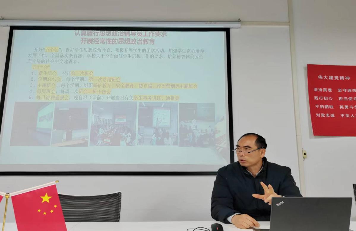 陈传宝老师分别从创建优良班风学风、发挥学生主体作用、确保社区安全稳定、全面做好就业工作等四个方面向大家分享宝贵经验。陈老师分享到,在建设班风学风方面,需要加强思政引领,做好党团工作;落实沉浸式课堂规范,全面关注学生学业,提高自主学习能力;精心组织开展主题班会;加强与特殊学生、家长沟通,关注学生身心健康,营造和谐育人环境。