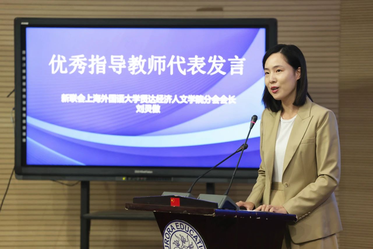 新联会上海外国语大学贤达经济人文学院分会会长刘灵傲作为优秀指导教师代表发言,她分享了指导学生参赛的经验,并强调学生的备赛过程不仅是技能的培养,更是对综合素质的提升。
