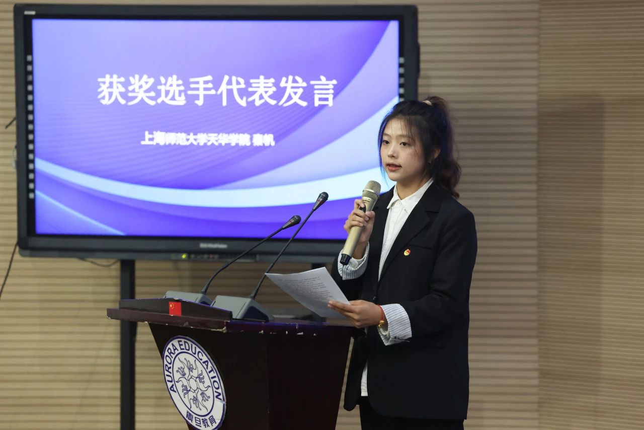 上海师范大学天华学院的秦帆同学作为获奖学生代表发言,她分享了此次参赛的心得体会,并呼吁更多学生参与到演示文稿设计与演讲大赛中来,展示青年学子才艺。
