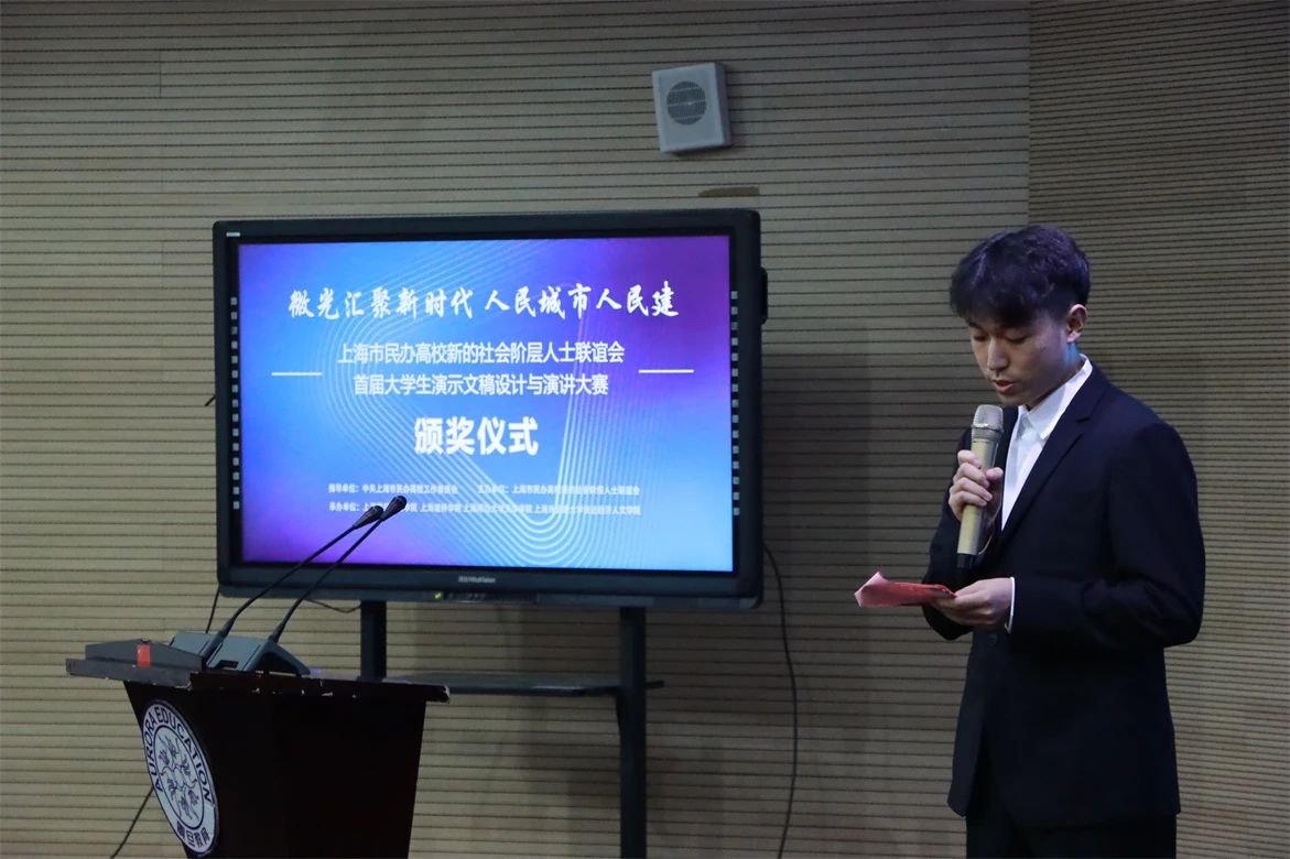 9月27日下午,首届“上海市民办高校大学生演示文稿设计与演讲大赛”颁奖典礼在上海震旦职业学院体艺楼国际会议中心隆重举行。上海市民办高校党工委二级主任科员周光狼,震旦教育创始人、震旦教育发展基金会理事长张惠莉,上海震旦职业学院党委书记吴松、副校长王纯玉,新联会秘书处、上海建桥学院统战部副部长潘明芸,新联会上海师范大学天华学院分会会长裔勇刚,新联会上海外国语大学贤达经济人文学院分会会长刘灵傲等出席颁奖典礼。典礼由上海震旦职业学院智能工程学院教师徐凯主持。